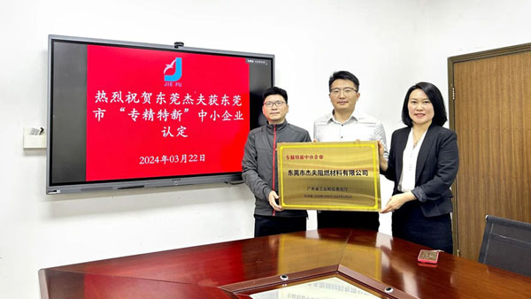 3月22日,东莞市“专精特新”企业联合会一行来东莞杰夫阻燃材料有限公司开展“企业授牌及走访调研”并举行授牌仪式,东莞杰夫总经办主任李康、财务经理封东弟参加授牌仪式,并与专精特新企业联合会就政策支持、开展市场拓展、产业链上下游对接合作,提供技术咨询及产学研合作,搭建融资桥梁解决融资难题展开了深入的交流。