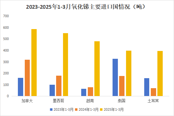 分国别来看,1-3月中国出口氧化锑主要销往加拿大、墨西哥、越南、泰国、土耳其等国家和地区,分别为加拿大588.0吨,同比上升83.7%;墨西哥551.5吨,同比上升206.4%;越南479.6吨,同比上升510.9%;泰国379.5吨,同比上升124.5%;土耳其397.0吨,同比上升456.8%。