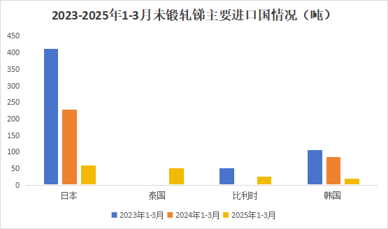 分国别来看,2025年1-3月中国出口未锻轧锑销往日本60.0吨,同比下降73.6%;泰国52.0吨,去年同期没有出口泰国氧化锑;比利时25吨,去年同期没有出口比利时氧化锑;韩国20吨,同比下降76.5%。