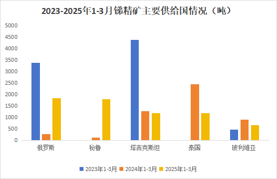 分国别来看,1-3月中国进口的锑矿砂及精矿主要来自俄罗斯、秘鲁、泰国、塔吉克斯坦、玻利维亚等国家和地区,分别为俄罗斯1852.6吨,同比上涨567.5%;秘鲁1795.8吨,同比上涨13%;塔吉克斯坦1197.1吨,同比下降6.0%;泰国1185.0吨,同比下降51.8%;缅甸675.9吨,同比下降26.0%。