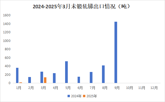 未锻轧锑出口方面,2025年3月中国未锻轧锑出口量为137.0吨,2月没有出口未锻轧锑,同比下降49.8%;1-3月未锻轧锑出口量为157.0吨,同比下降80.0%。