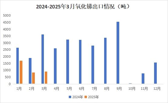 据海关统计数据显示,2025年3月中国氧化锑出口量为901.0吨,环比上升7.3%,同比下降75.2%;1-3月氧化锑出口量为3447.8吨,同比下降58.0%。