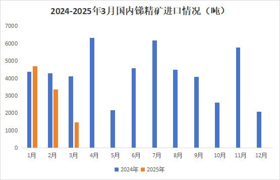 据海关统计数据显示,2025年3月中国锑矿砂及精矿进口量为1483.0吨,环比下降55.8%,同比下降63.9%;1-3月锑矿砂及精矿进口量为9530.2吨,同比下降25.5%。