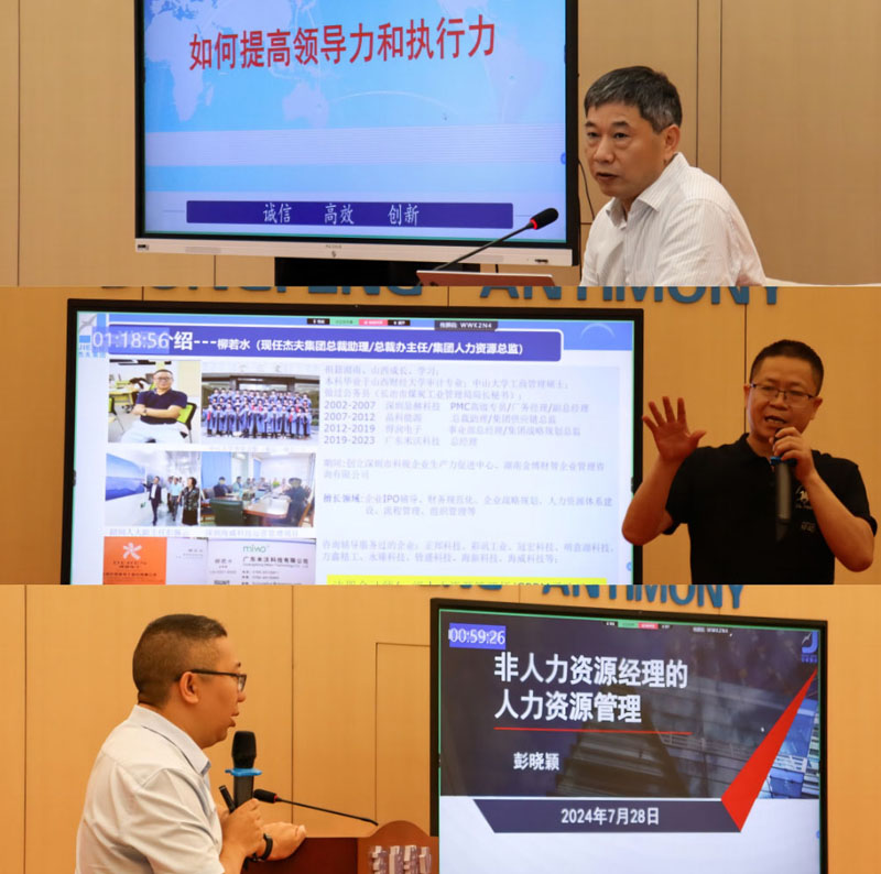 锑业商学院开展了第三季度培训。本次培训邀请到东峰股份人力资源总监彭晓颖、杰夫集团总裁助理柳若水、行业资深专家陈建权三位老师倾情授课。