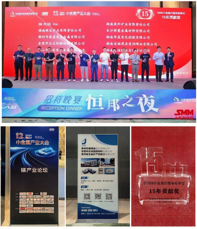 6月20日-6月21日,2024年SMM第十二届小金属产业大会在苏州召开,贵州东峰锑业股份有限公司副总经理、东莞市杰夫阻燃材料有限公司总经理吕芳炜出席会议。SMM对各采标单位多年来所做出的贡献和支持表示感谢,为15年以上的小金属价格采标单位进行了颁奖。